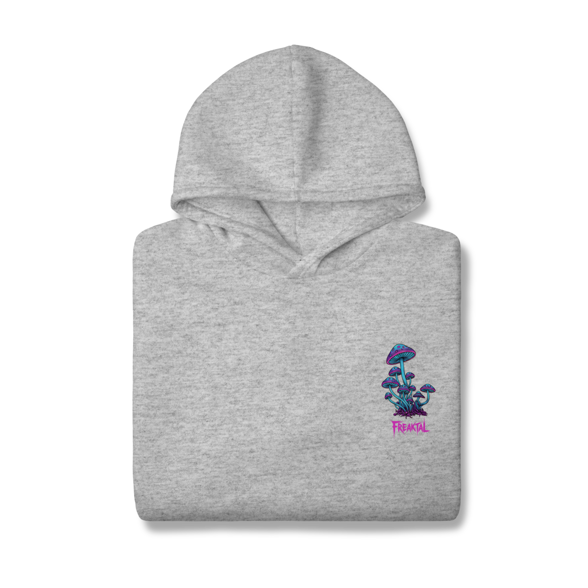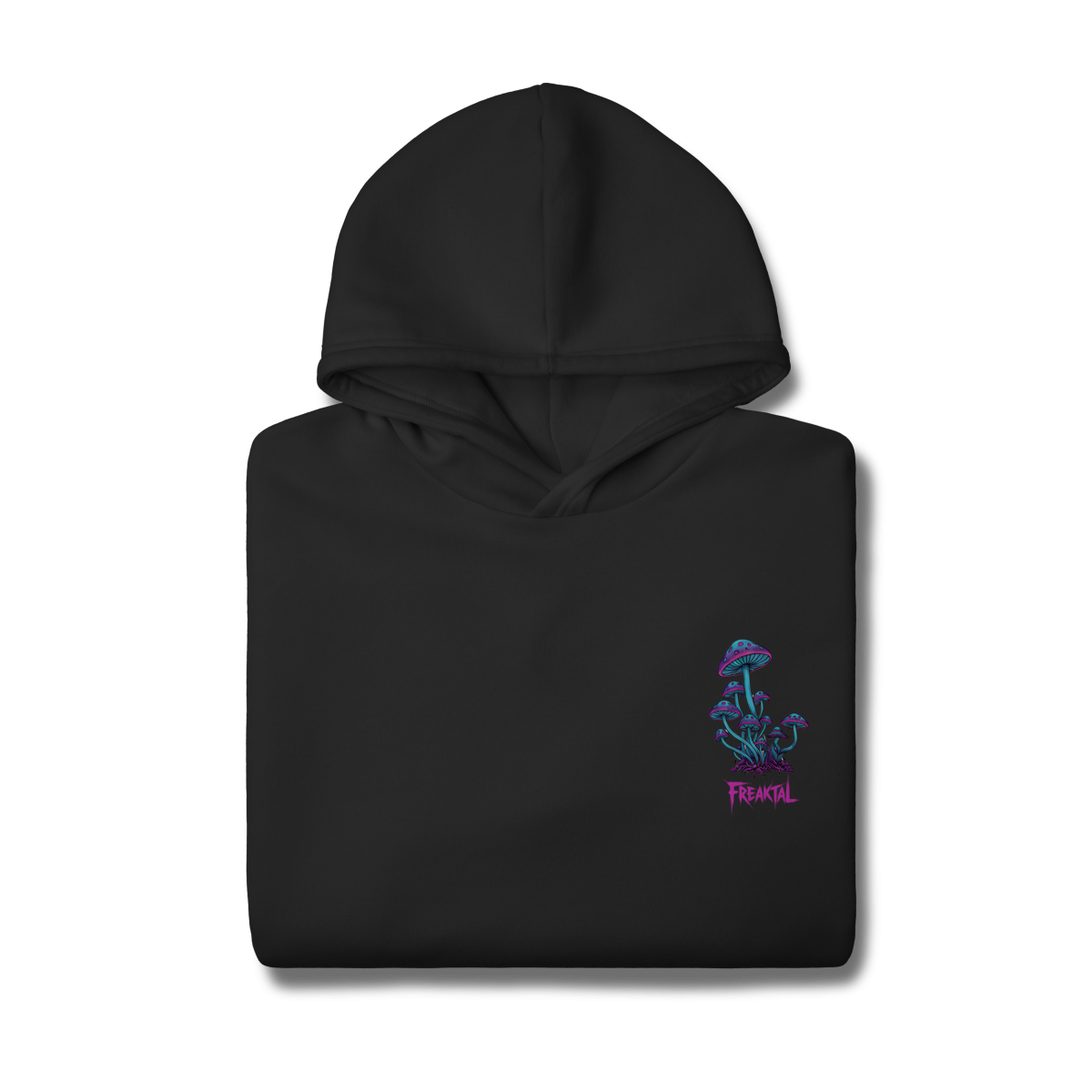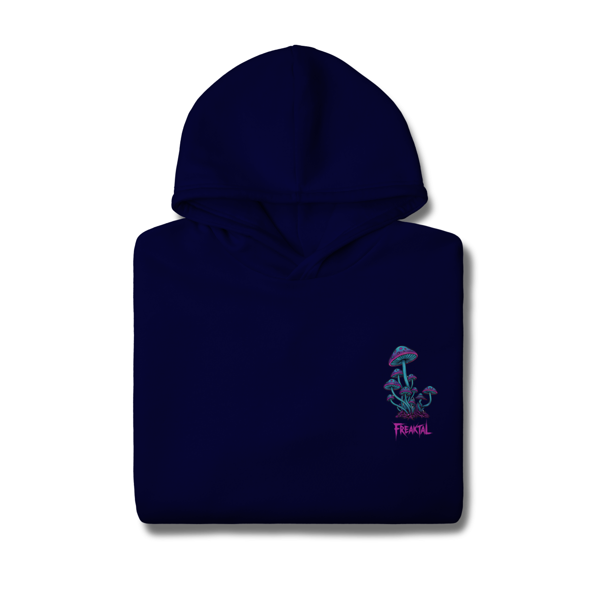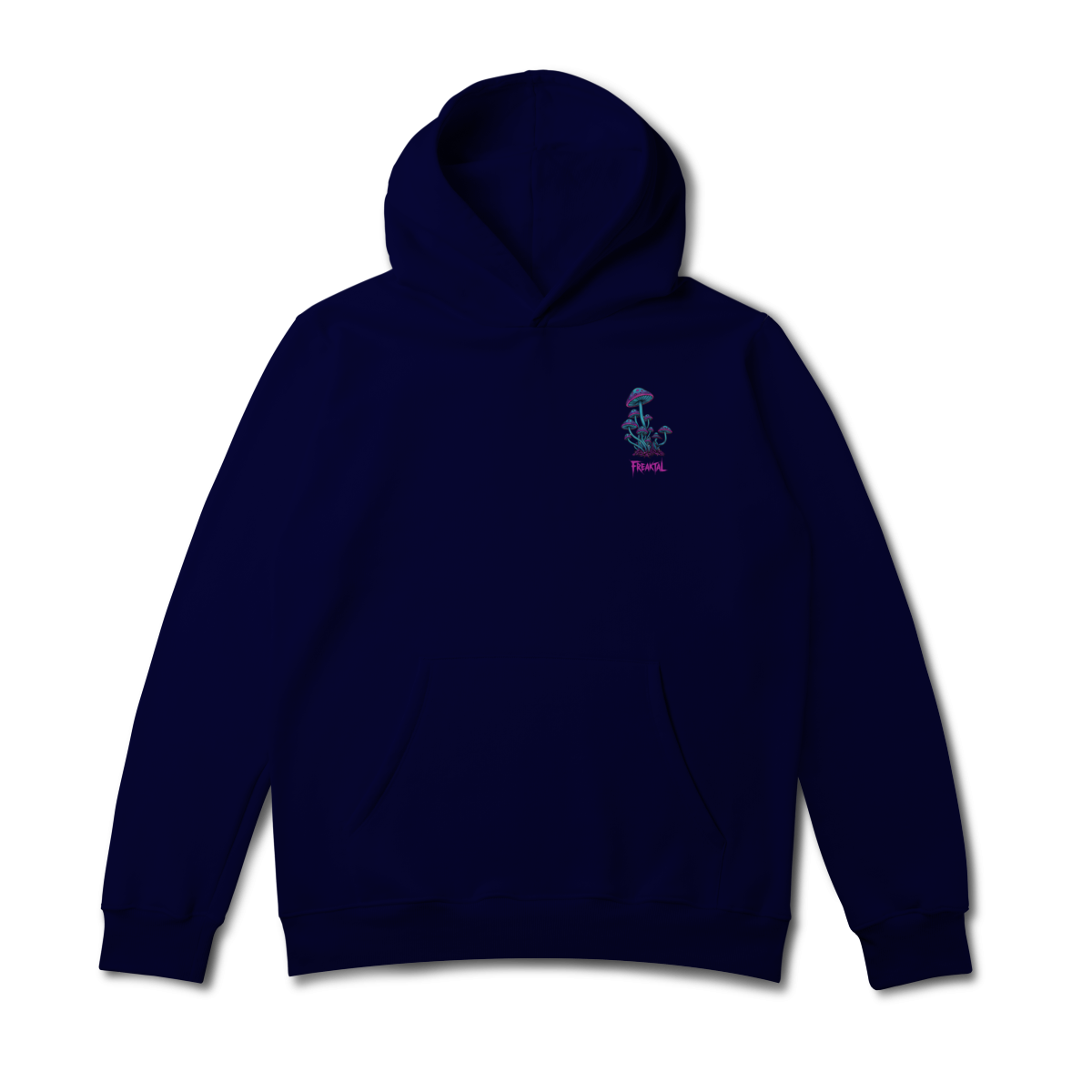Este design é a síntese da experiência noturna: a conexão orgânica da natureza (os fungos) com o fluxo dimensional (o túnel de linhas) que o som do psytrance cria. É a estampa perfeita para quem abraça a complexidade do trance mais profundo e noturno.