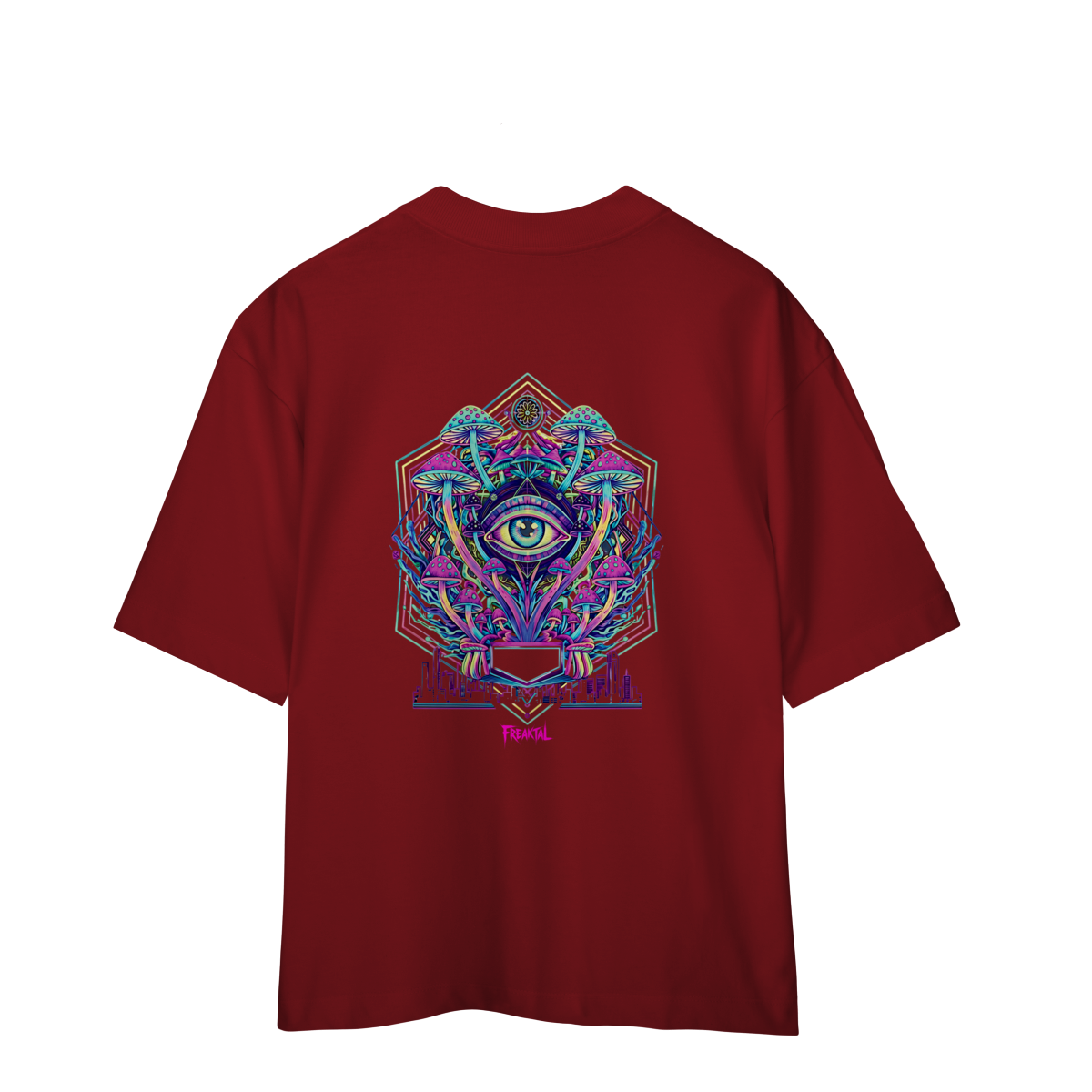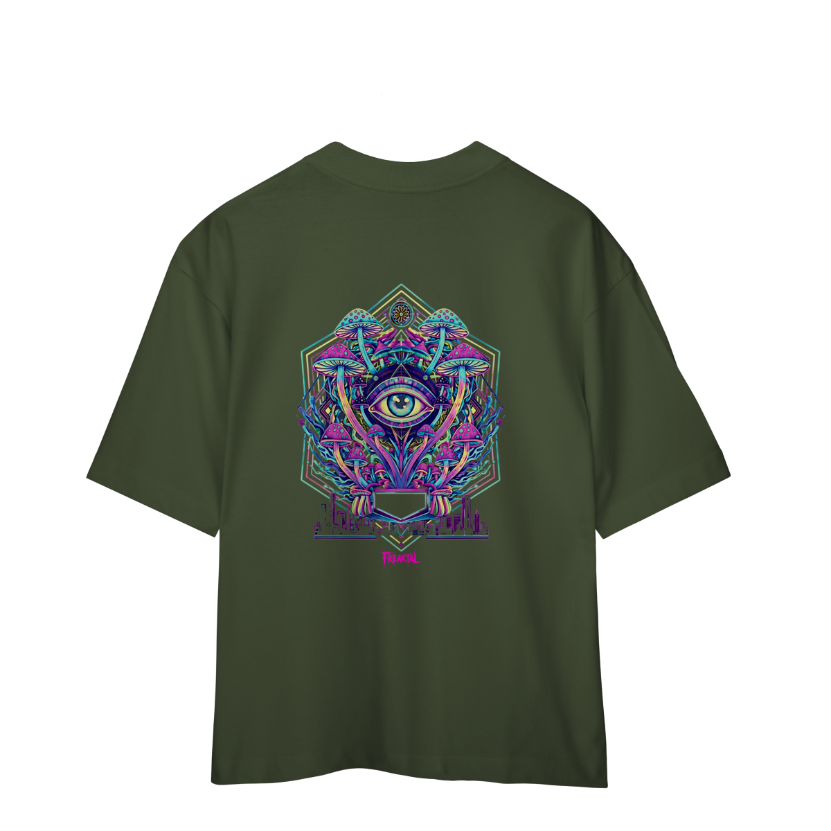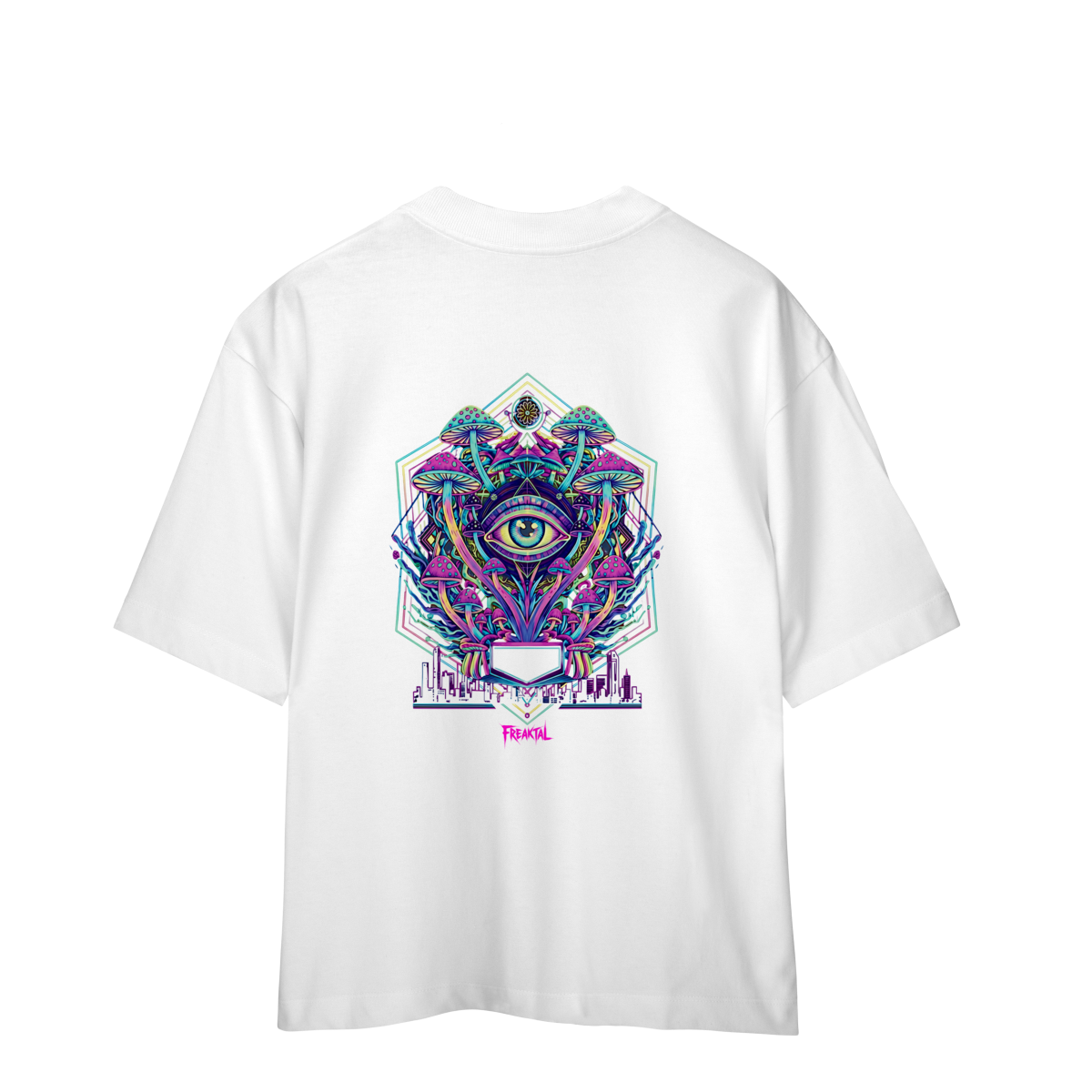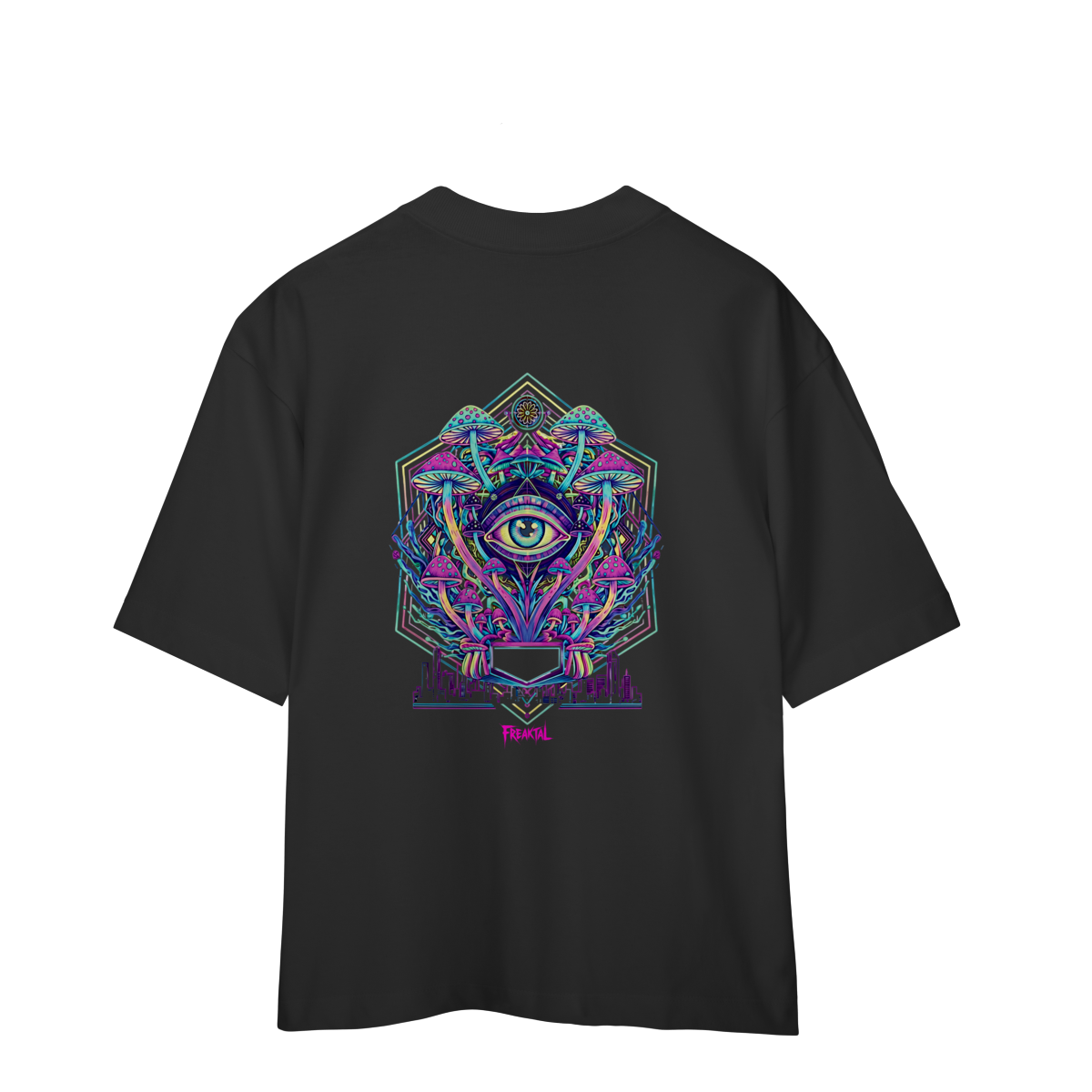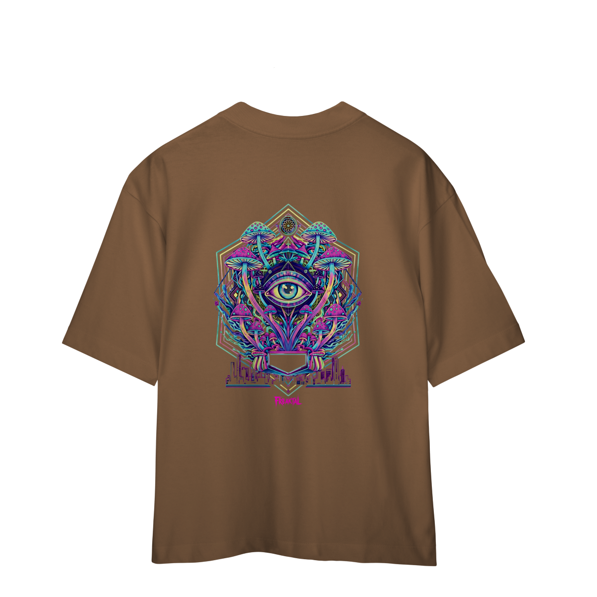 A estampa Cogueye é a sua passagem direta para o mindscape mais profundo. Ela funde o elemento primordial da natureza psicodélica (o cogumelo) com a visão expandida (o olho central), simbolizando o guia que aparece quando a frequência da música te leva para longe.