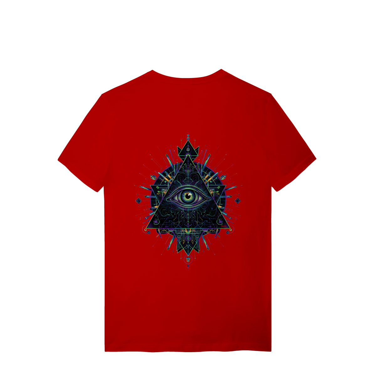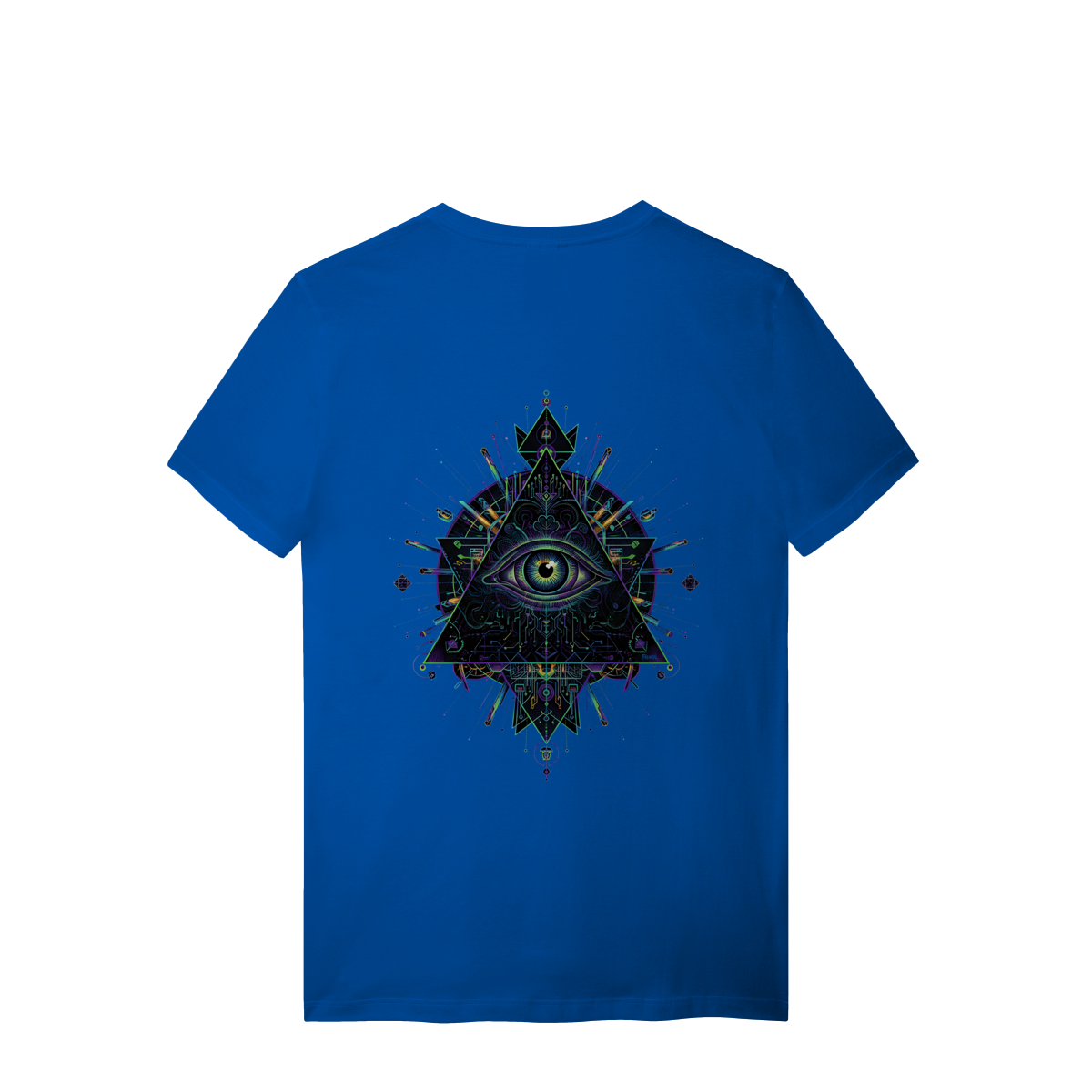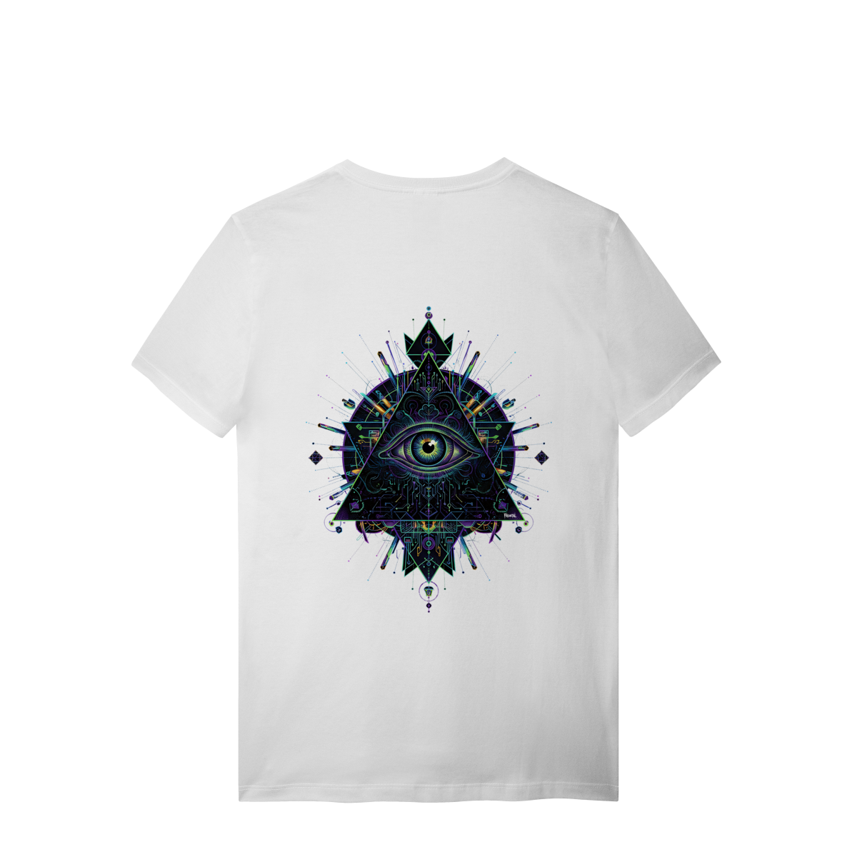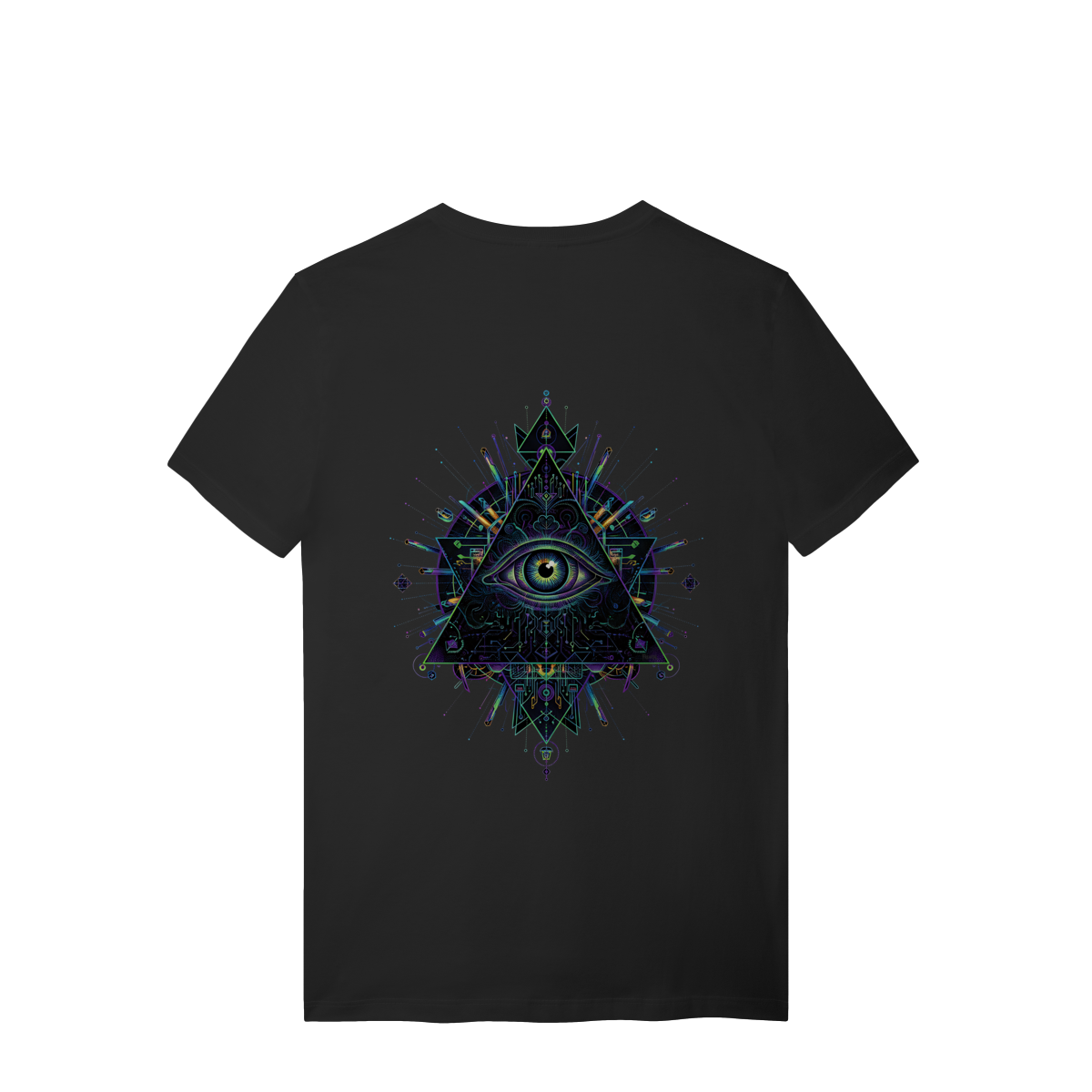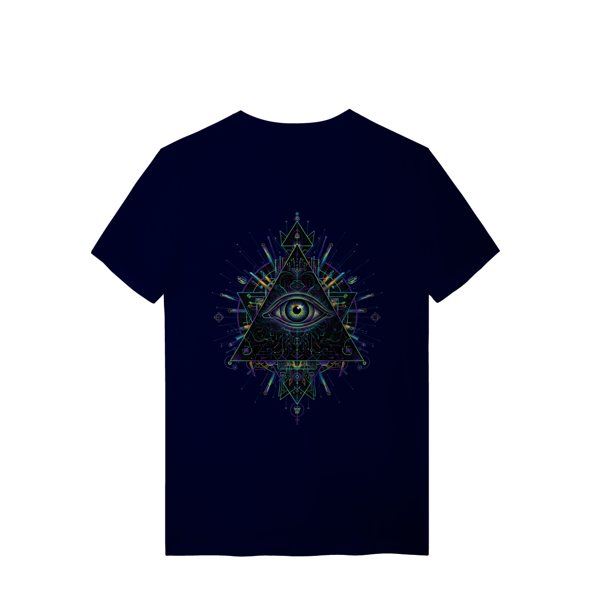 A estampa Omnivision é um mergulho no universo do conhecimento expandido. Com o Terceiro Olho no centro de uma pirâmide geométrica high-tech, ela representa a Visão Total que desvenda os códigos do som e da consciência na pista.