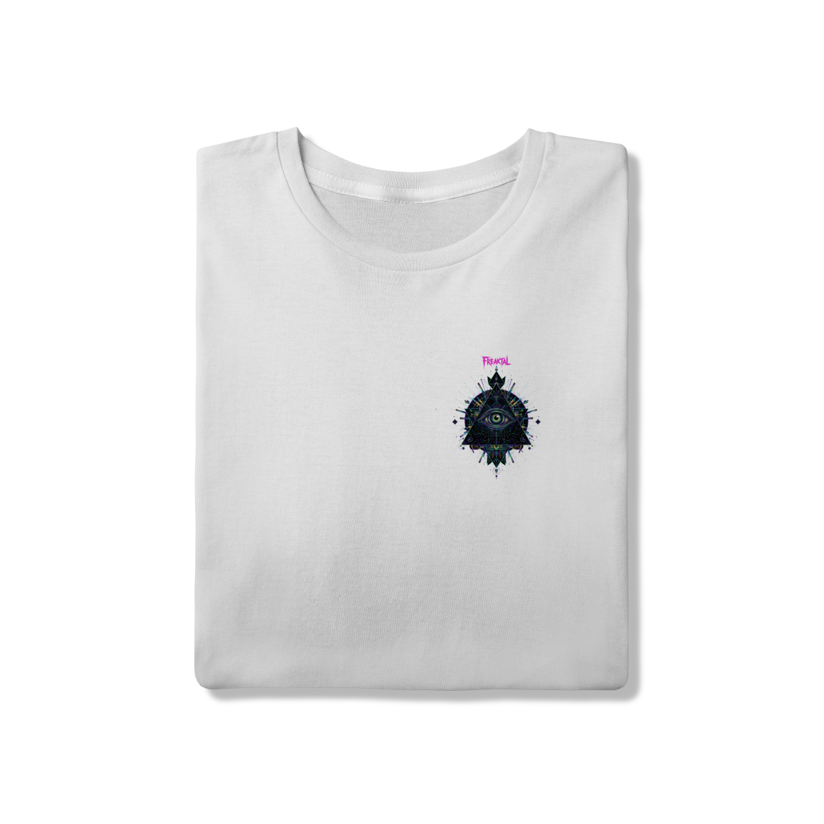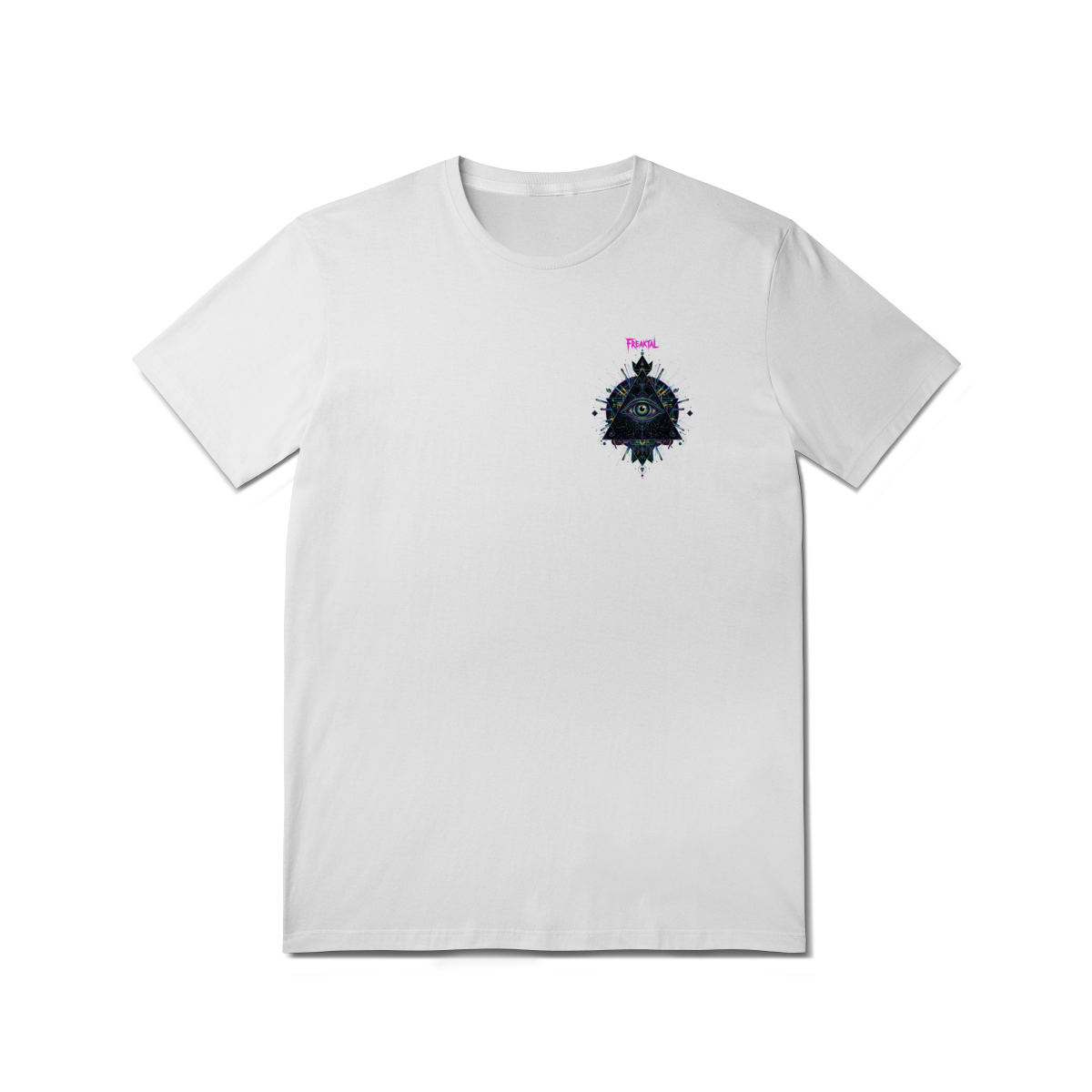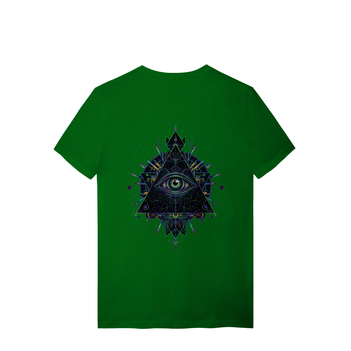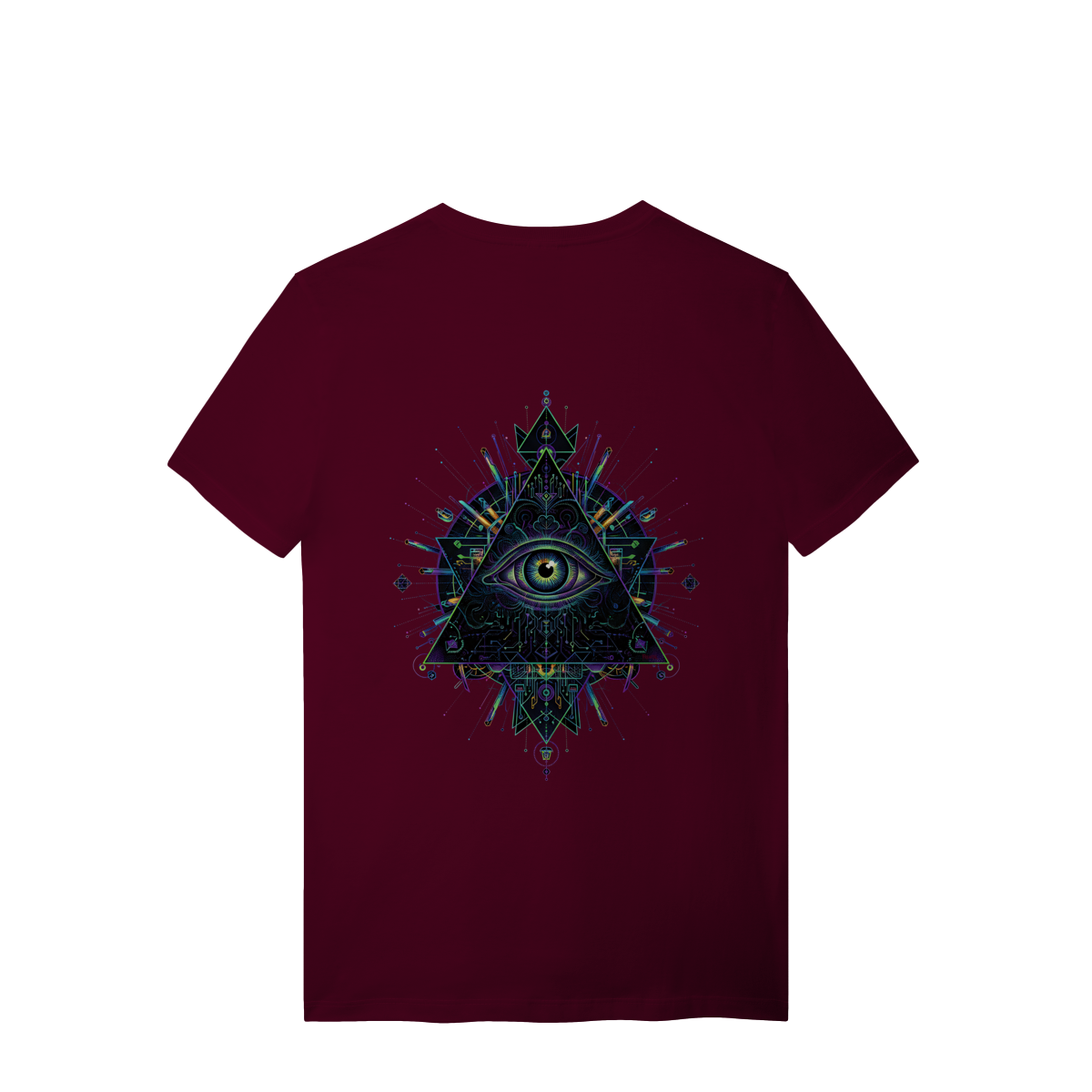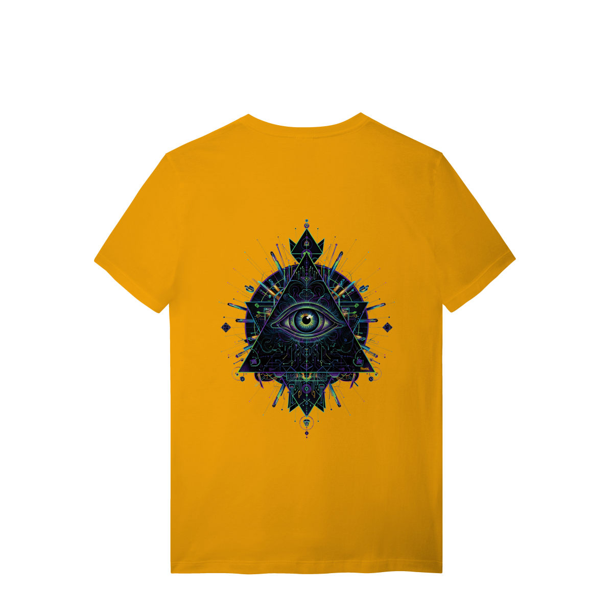 A estampa Omnivision é um mergulho no universo do conhecimento expandido. Com o Terceiro Olho no centro de uma pirâmide geométrica high-tech, ela representa a Visão Total que desvenda os códigos do som e da consciência na pista.